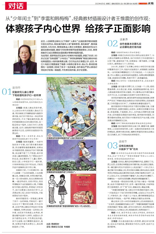 王惟震。 王惟震创作的教材插画作品“让我们荡起双桨”。 王惟震创作的插画作品“少年闰土”。 王惟震创作的形象“李雷和韩