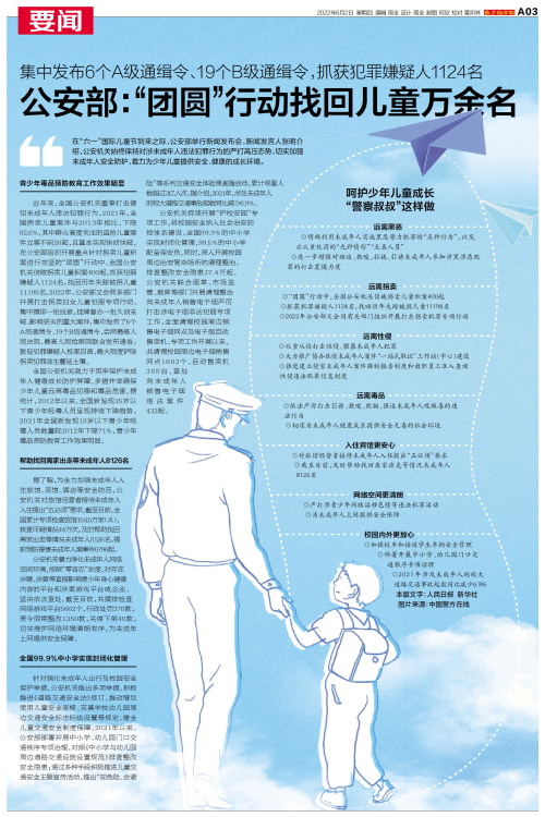 在“六一”国际儿童节到来之际,公安部举行新闻发布会,新闻发言人张明介绍,公安机关始终保持对涉未成年人违法犯罪行为的严打高压态势,切实加强未成年人安全防护,着力为少年儿童提供安全、健康的成长环境。