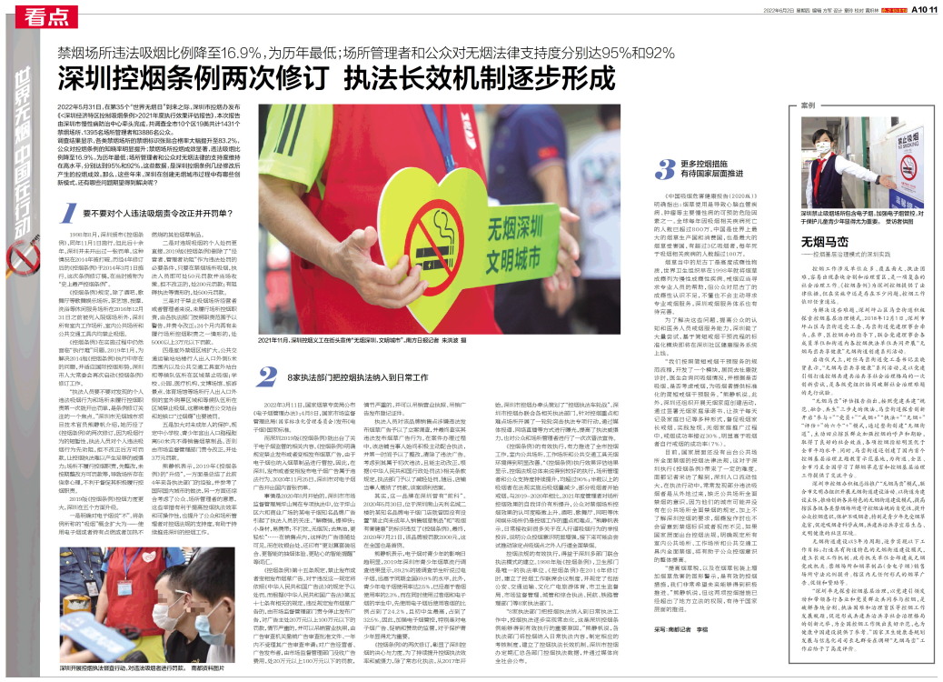 2022年5月31日,在第35个“世界无烟日”到来之际,深圳市控烟办发布《<深圳经济特区控制吸烟条例>2021年度执行效果评估报告》,本次报告由深圳市慢性病防治中心牵头完成,共调查全市