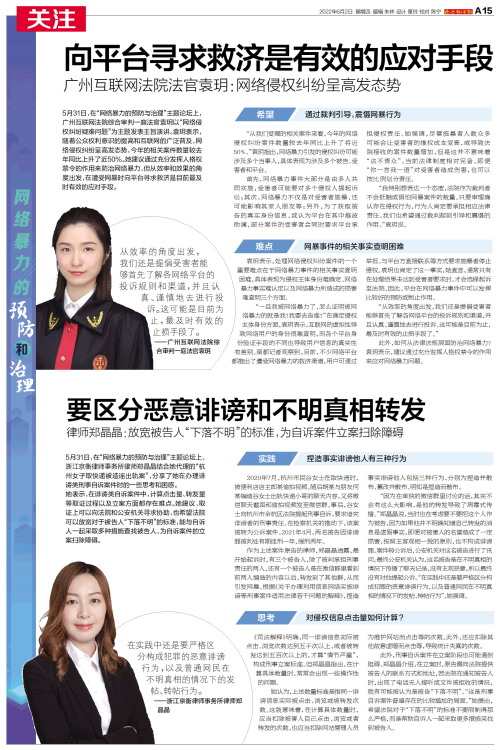 5月31日,在“网络暴力的预防与治理”主题论坛上,广州互联网法院综合审判一庭法官袁玥以“网络侵权纠纷疑难问题”为主题发表主旨演讲。袁玥表示,随着公众权利意识的提高和互联网的广泛普及,网络侵权纠纷呈