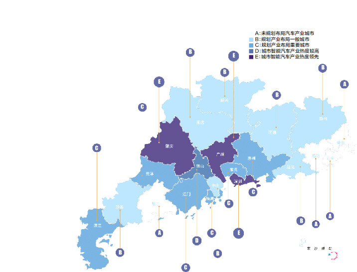 2021年10月,南方都市报智能汽车产业生态研究课题组发布《广东智能汽车产业吸引力报告(2021)》:由于新能源智能网联汽车产业的多业态融合发展特性,其已成广东省内各大城市竞相追逐的新兴产业热点。其中,广州、深圳、肇庆的智能汽车产业发展冲劲最强。