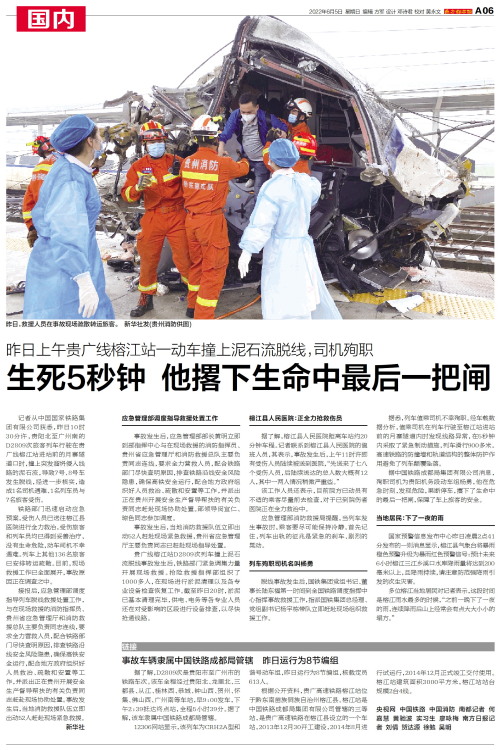 记者从中国国家铁路集团有限公司获悉,昨日10时30分许,贵阳北至广州南的D2809次旅客列车行驶在贵广线榕江站进站前的月寨隧道口时,撞上突发溜坍侵入线路的泥石流,导致7号、8号车发生脱线,经进一步
