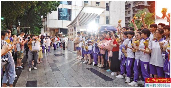 昨天下午18时15分,随着生物科目考试结束的铃声响起,广东全省高考顺利结束。在执信考点外,执信辩论队的高二学生带着明信片、卡片、奶茶鲜花等礼物迎接学长学姐。“这是我们辩论队的传统,恭喜学长和学姐能够卸除繁重的高三压力。”一位高二学生说道:“当然我们也是非常希望能够得到他们的笔记。”鲜花、拥抱、笑容、泪水……考生们迈出考场走向未来,南都教育联盟记者全天直击考点现场,记录考生和家长们的期望与感动。