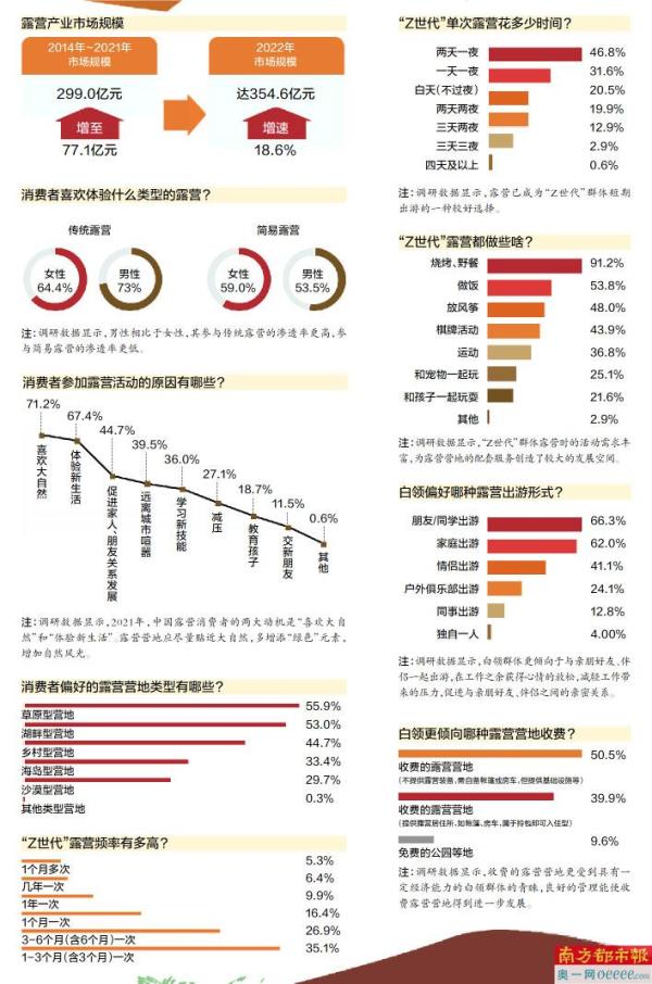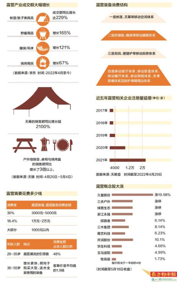 随着露营成为假日户外活动的“顶流”,帐篷、天幕、野餐用品、睡袋等一大批露营装备及相关户外产品的成交额进入了翻倍增长模式,帐篷生产厂家启动预订销售模式。露营经济的热度也从消费市场传导到资本市场,露营概念股全线上涨。这股热度如今还在破圈,各方资本花式出招试图挤进露营赛道。渤海证券研报表示,2021年露营产业市场规模达299亿元,预计2022年,市场规模将突破350亿元。未来,通过“营地+”的模式,将会促进露营全产业链的发展。