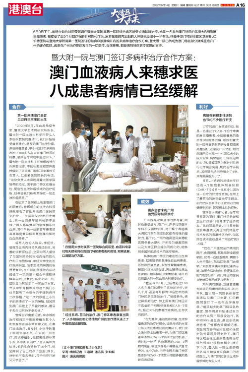 澳门血液病人来穗求医 八成患者病情已经缓解