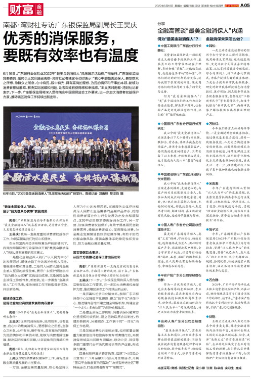 6月16日,广东银行业保险业2022年“最美金融消保人”风采展示活动在广州举行。广东银保监局党委委员、副局长王吴庆接受南都·湾财社记者独家专访时表示:“我心中的最美消保人,要想群众之所想,急群众之