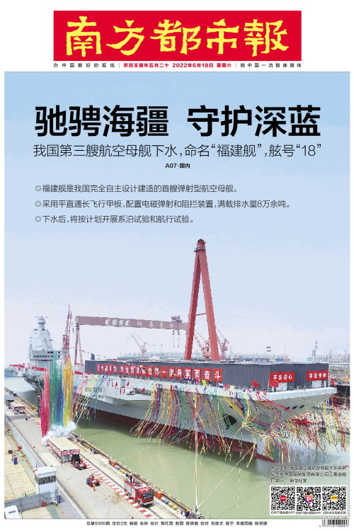 ◎福建舰是我国完全自主设计建造的首艘弹射型航空母舰。 ◎采用平直通长飞行甲板,配置电磁弹射和阻拦装置,满载排水量8万余吨。 ◎下水后,将按计划开展系泊试验和航行试验。 详见:A07·国内