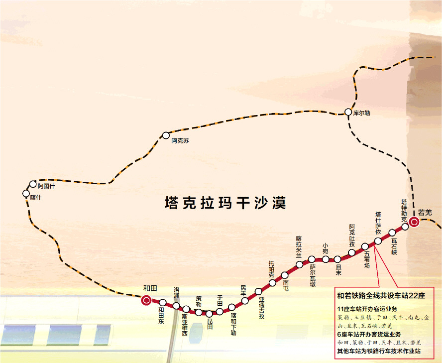 和若铁路与格尔木至库尔勒铁路若羌至库尔勒段、南疆铁路库尔勒至喀什段、喀什至和田段共同构成长达2712公里的环塔克拉玛干沙漠铁路环线,这也是世界首个沙漠铁路环线。该环线途经新疆巴音郭楞蒙古自治州、阿克苏地区、克孜勒苏柯尔克孜自治州、喀什地区、和田地区等5个地州,覆盖南疆地区上千万各族群众。这一铁路的建成通车,结束了和田地区洛浦、策勒、于田、民丰等县和巴音郭楞蒙古自治州且末县等地不通火车的历史,将进一步完善新疆铁路网结构,加快西部边疆铁路网建设,极大便利沿线各族人民群众出行和货物运输,带动沿线资源开发,对维护民族团结,巩固边疆国防,助力乡村振兴,具有十分重要的意义。