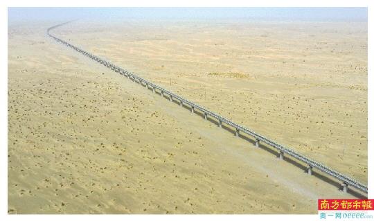 2、过沙桥 过沙桥针对部分区段风沙大、沙丘动态迁移容易掩埋线路的问题,建设者采取以桥代路方式,建成总长达49.7公里的过沙桥5座,让风沙从桥下穿过,大幅降低风沙对线路的侵害威胁。