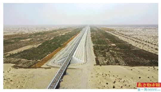 1000多个施工日夜里,建设者在和若铁路沿线共修建草方格近5000万平方米,种植梭梭、红柳、沙棘等灌木和乔木近1300万株,林带覆盖面积超过11万亩。这条长300公里的“绿色走廊”已成为防风沙的屏障。