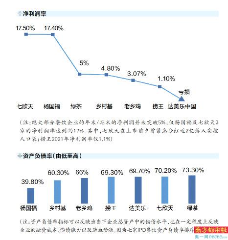 南都湾财社统计了餐饮企业们的相关财务指标。在最新审计期的资产负债率上,绿茶、七欣天、达美乐、捞王、老乡鸡、乡村基(资产负债率排名由高到低)等6家资产负债率居高不下,徘徊在60%至73%之间,平均下来这几家的资产负债率约68%,逼近7成。