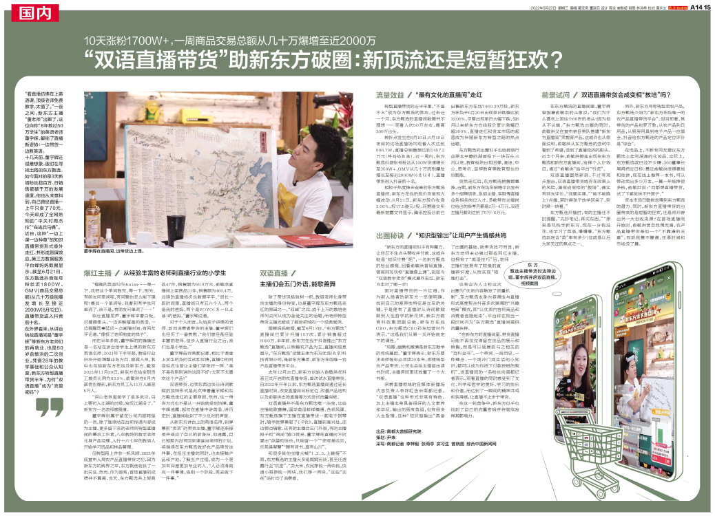 “在新东方的直播间里,带货直播可能不再仅仅停留在货品的展示和销售,而是可以延展到与之相关的“百科全书”,一个单词、一段历史、一种理念、一个或冷门或生活的小知识,都可以成为你按下付款按钮的契机”,该直播间的一名粉丝向南都记者表示,观看直播的同时感受到了文化、科学和哲学的美好,学习的快乐和价值,而达到了一瞬间的精神共鸣和获得感,让直播不止步于带货。