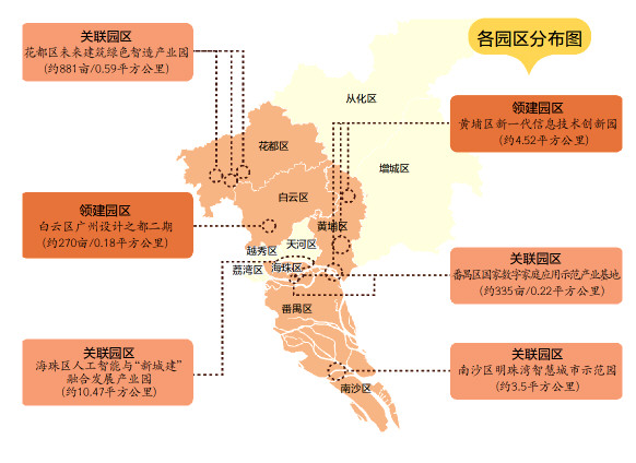 4个关联园区分别位于海珠区、花都区、番禺区和南沙区。其中,海珠区以广州市人工智能和数字经济试验区为依托,面向“新城建”领域提供体系化的人工智能服务,在市“新城建”综合示范试点基础上,打造人工智能与“新城建”融合发展产业园,园区面积10.47平方公里。