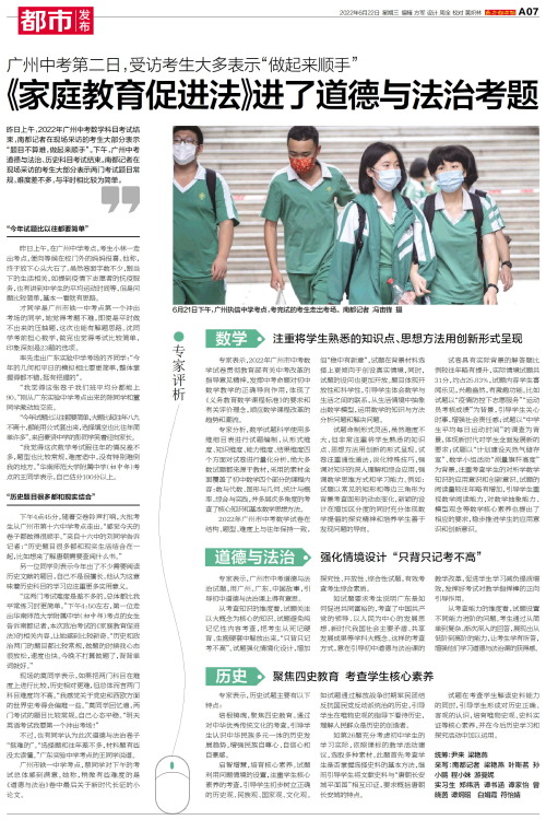 昨日上午,2022年广州中考数学科目考试结束,南都记者在现场采访的考生大部分表示“题目不算难,做起来顺手”。下午,广州中考道德与法治、历史科目考试结束。南都记者在现场采访的考生大部分表示两门考试题