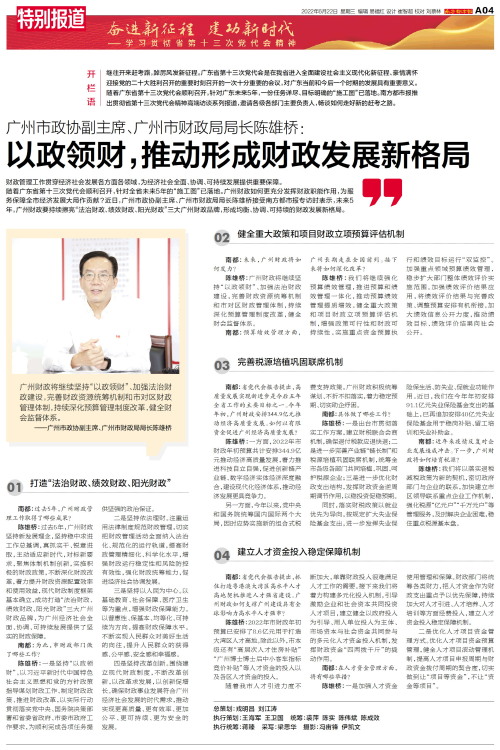 广州市政协副主席、广州市财政局局长陈雄桥 开栏语 继往开来赶考路,踔厉风发新征程。广东省第十三次党代会是在我省进入全面建设社会主义现代化新征程、豪情满怀迎