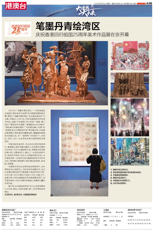 6月24日,“笔墨丹青绘湾区——庆祝香港回归祖国25周年美术作品展”在中国国家博物馆开幕。展览以“笔墨丹青绘湾区 流光溢彩画未来”为主题,共展出116件(组)内地及港澳美术家的美术作品,涵盖“中央