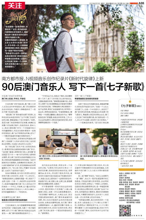 “给祖国唱一首粤语情歌,你想听吗?”近日,南方都市报、N视频联合多位唱作人,重磅推出的13集音乐创作纪录片《新时代旋律》上新。本集的特邀唱作人黎翰澄,是土生土长的90后澳门音乐人。作为年轻一代,让