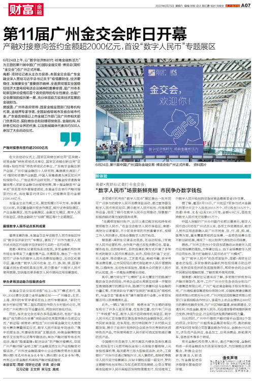 6月24日上午,以“数字经济新时代·岭南金融新活力”为主题的第11届中国(广州)国际金融交易·博览会(简称“金交会”)在广州正式开幕。南都·湾财社记者从主办方获悉,本届金交会是广东金融业深入贯彻习