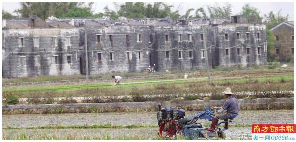 台山冲蒌镇天荣新村,男子驾驶手扶拖拉机耕地。 南都资料图