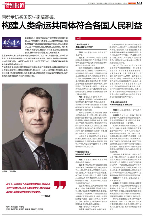 2014年3月,国家主席习近平在柏林会见德国汉学家、孔子学院教师代表和学习汉语的学生代表,同他们就加强中德语言文化交流进行座谈。时任杜塞尔多夫孔子学院德方院长培高德,近日接受了南方都市报、N视频专