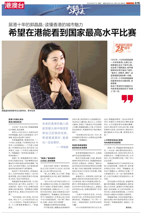 郭晶晶在接受新华社记者专访。 新华社发 1995年,14岁的郭晶晶第一次来到香港。比赛之余,她跟着队友去了海洋公园,还品尝了海鲜美食。她怀着新鲜和好奇打量这个城市,