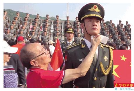 一次升旗仪式上,有香港市民为驻港官兵擦汗。 中国人民解放军驻香港部队供图