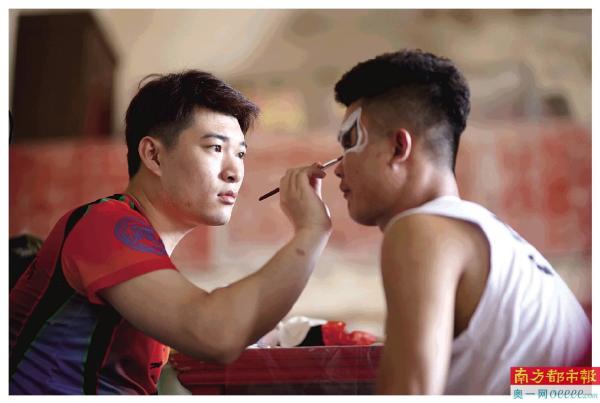 平日里,无需专业的化妆师,参照脸谱书籍、英歌舞队员相互就能画脸上妆,这些妆容夸张泼辣,唯有红黑白油彩才能尽情展现。“你今天画的妆是扈三娘,是文脸。”在主播陈诚的脸被覆上白色油彩时,林教练解释道。这一回,林教练扮演的角色是林冲,画的是武脸。