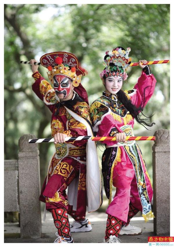 以玫粉色为主色调,配上腰封、云肩和黄色流苏做点缀,主播陈诚已换好扈三娘戏服。在老戏台上,英歌舞队员正紧锣密鼓地换装画脸,为即将到来的表演做最后的准备。
