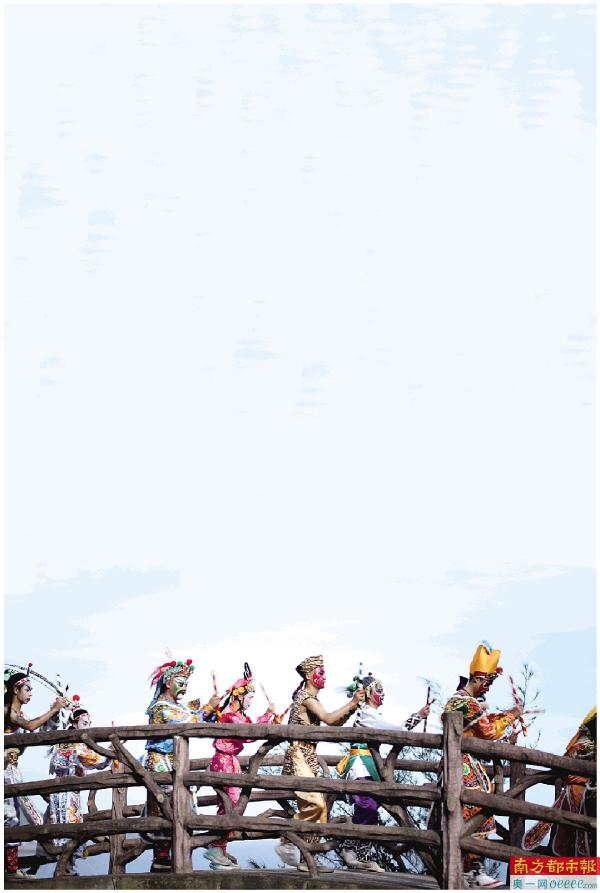 英歌舞表演变化纷繁,每人手执一对彩色木棒,双脚成骑马蹲裆步,提腿向横跃动,配合锣鼓点和吆喝,挥动双棒交错翻转叩击,边走边舞。俯瞰潮阳海门镇,表演队伍和大海蓝天同绘成一幅人文风景画。