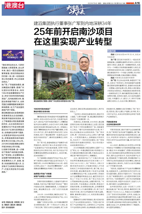 “我在深圳出生长大,13岁时跟随家人移居香港。这么多年来,我们一路见证国家的繁荣富强,现在回想起亲历回归那一刻,那一份民族自信心和自豪感,内心还是激动无比。”张广军,广东省政协委员,建滔集团执行董