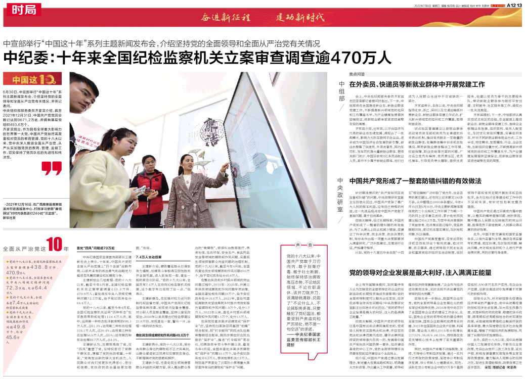 6月30日,中宣部举行“中国这十年”系列主题新闻发布会,介绍坚持党的全面领导和全面从严治党有关情况,并答记者问。中央组织部部务委员齐家滨介绍,截至2021年12月31日,中国共产党党员总数已达到9