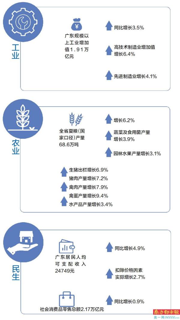 ◎在异常复杂困难局面下,广东主要经济指标实现正增长。其中规模以上工业增加值同比增长3.5%,固定资产投资同比增长1.0%,货物进出口总额3.91万亿元,同比增长2.8%。