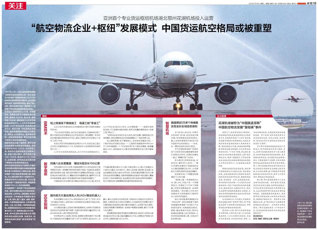 7月17日上午,一架从深圳宝安机场起飞的顺丰航空全货机以及一架从北京大兴机场起飞的南方航空CZ5679次航班先后降落鄂州花湖机场,成为该机场开航后飞抵的首班货运、客运飞机。当天,鄂州花湖机场这个我