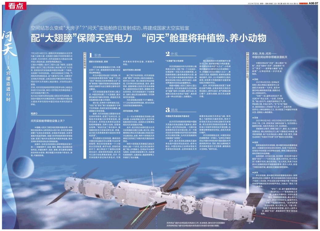 配“大翅膀”保障天宫电力 “问天”舱里将种植物、养小动物