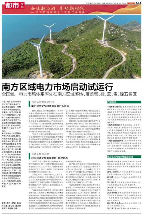 日前,南方区域电力市场试运行启动会举行,这标志着全国统一电力市场体系率先在南方区域落地。当天,云南、贵州、广东合计超过157家电厂和用户通过南方区域电力市场交易平台,达成南方区域首次跨省现货交易,