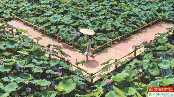 ←7月24日,广州番禺莲花山莲花盛开,一位女子在炎炎烈日下经过。 南都拍客 陆建生 摄