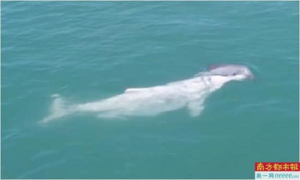 在湛江湾海域,一头刚出生的中华白海豚宝宝已经死了,一头成年海豚一直托着它,快要掉下去的时候,又用头把它顶上来,怕它沉下去。