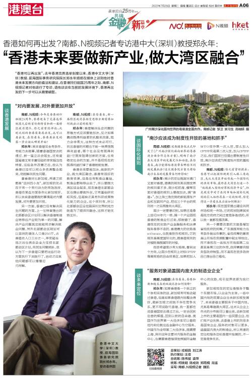 香港中文大学(深圳)教授、前海国际事务研究院院长郑永年。 受访者供图 广州南沙深化面向世界的粤港澳全面合作。 南都记者 邹卫 实习生 高暄妍 摄