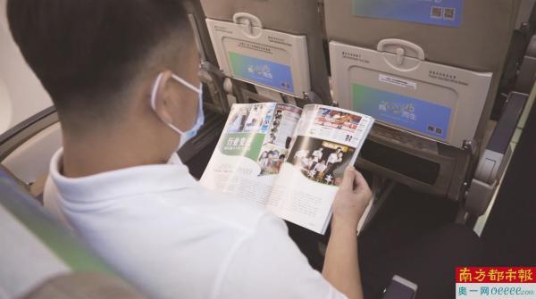 乘客在阅读 《南都娱乐》杂志十六周年主题飞机飞上天,这是南都娱乐首次与航空公司的跨界联动。