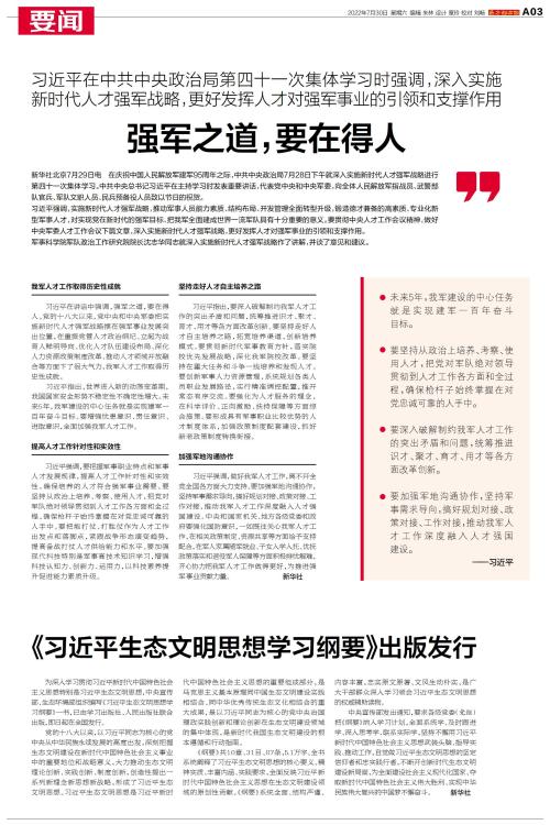 新华社北京7月29日电 在庆祝中国人民解放军建军95周年之际,中共中央政治局7月28日下午就深入实施新时代人才强军战略进行第四十一次集体学习。中共中央总书记习近平在主持学习时发表重要讲话,代