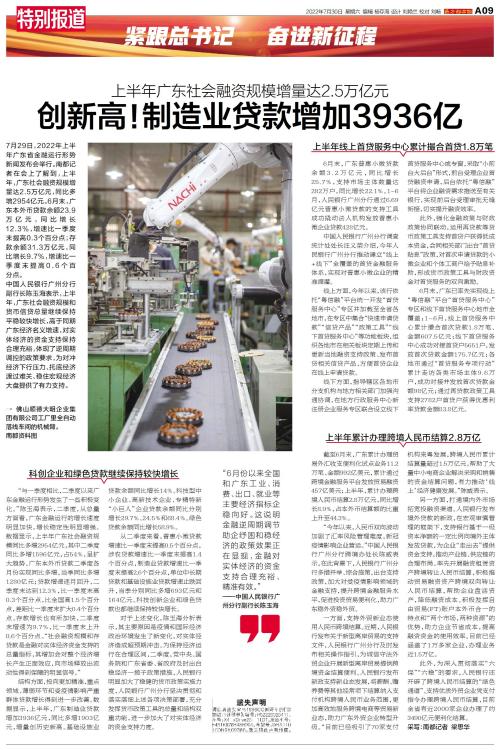 7月29日,2022年上半年广东省金融运行形势新闻发布会举行。南都记者在会上了解到,上半年,广东社会融资规模增量达2.5万亿元,同比多增2954亿元。6月末,广东本外币贷款余额23.9万亿元,同比