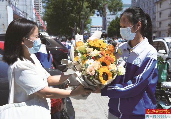 6月24日,北京2022年中考开考。一名考生家长为考生送上鲜花。 新华社发