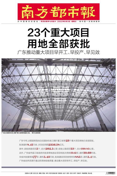 广东今年上报国务院的白云国际机场三期扩建工程等23个重大项目用地已全部获批, 批准面积8.41万亩,涉及投资额2356.18亿元。 其中,获批铁路项目5个,合计202.5公里;获批公路项目13