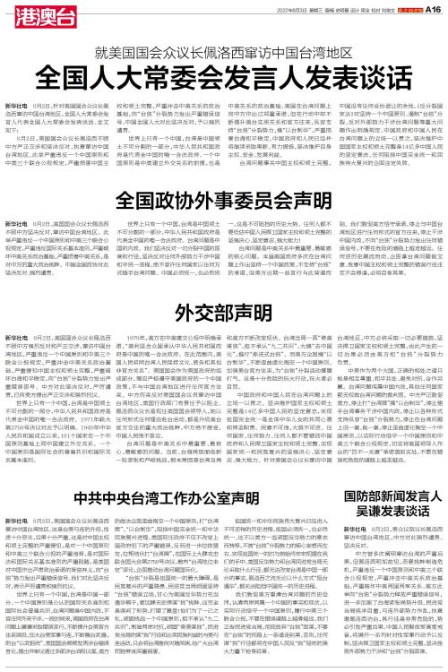 新华社电 8月2日,针对美国国会众议长佩洛西窜访中国台湾地区,全国人大常委会发言人代表全国人大常委会发表谈话。全文如下: 8月2日,美国国会众议长佩洛西不顾中方严正交涉和坚决反对,执意窜访中国台