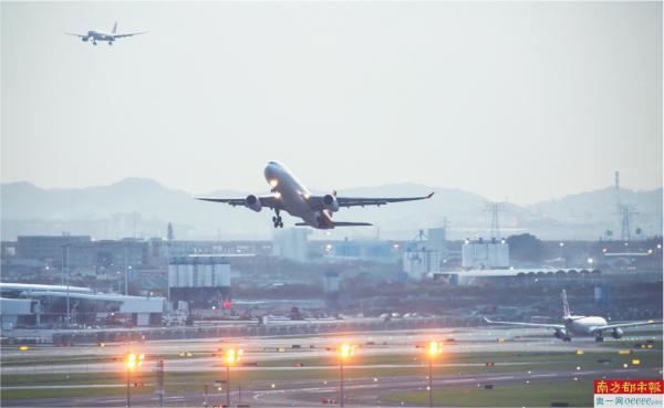 繁忙的深圳宝安国际机场一起飞、一降落、一滑行三机同框。 南方日报记者 鲁力 摄