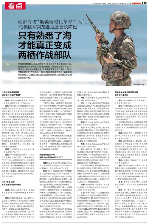 作为合成营营长,在改革转型中,陈松深研跨海突击训法打法,助推营队实现了转型升级,着力破解了联合作战难点问题。入伍18年,陈松被陆军表彰为“优秀指挥军官标兵”,荣立二等功、三等功各2次。在今年八一期
