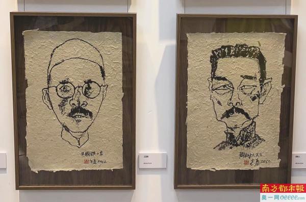 “以脸为书——杨小彦艺术展”上的王国维与鲁迅像。
