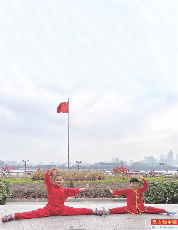 广州市中山大学北门广场,两位小女孩正在练习武术的基本动作一字马。 南都拍客 吴建业 摄(资料图)