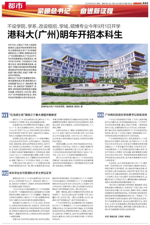 广州市教育局党组书记、局长陈爽表示,广州将推动合作办学模式不断创新,给予港科大(广州)更加充分的办学自主权。在享受与市属高校同等待遇的基础上,广州将在重点学科建设、科研项目立项、科研经费支持、人才引进等方面将给予重点支持,并给予学校在人员聘用、学科设置、教学管理等方面更加充分的办学自主权。“特别是争取面向港澳学生的多种类型自主招生政策,吸引更多港澳青年学生在大湾区就学。”
