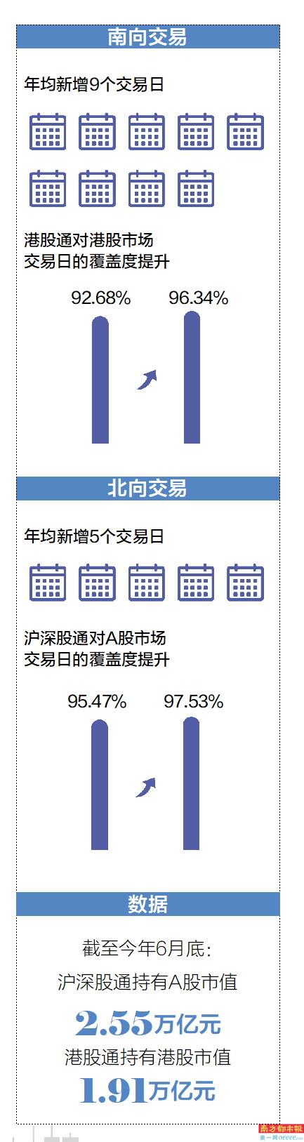 截至今年6月底,沪深股通持有A股市值2.55万亿元,港股通持有港股市值1.91万亿元,已成为参与两地市场运行的重要力量。随着互联互通机制的发展深化,两地投资者对于优化沪深港通交易日历、增加交易日的需求日益增强。